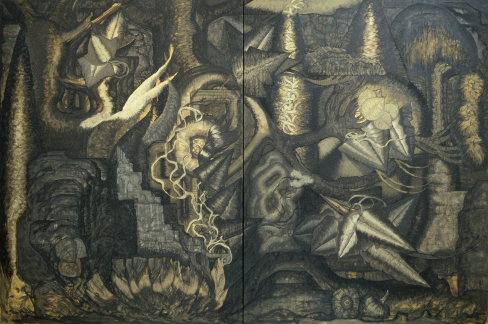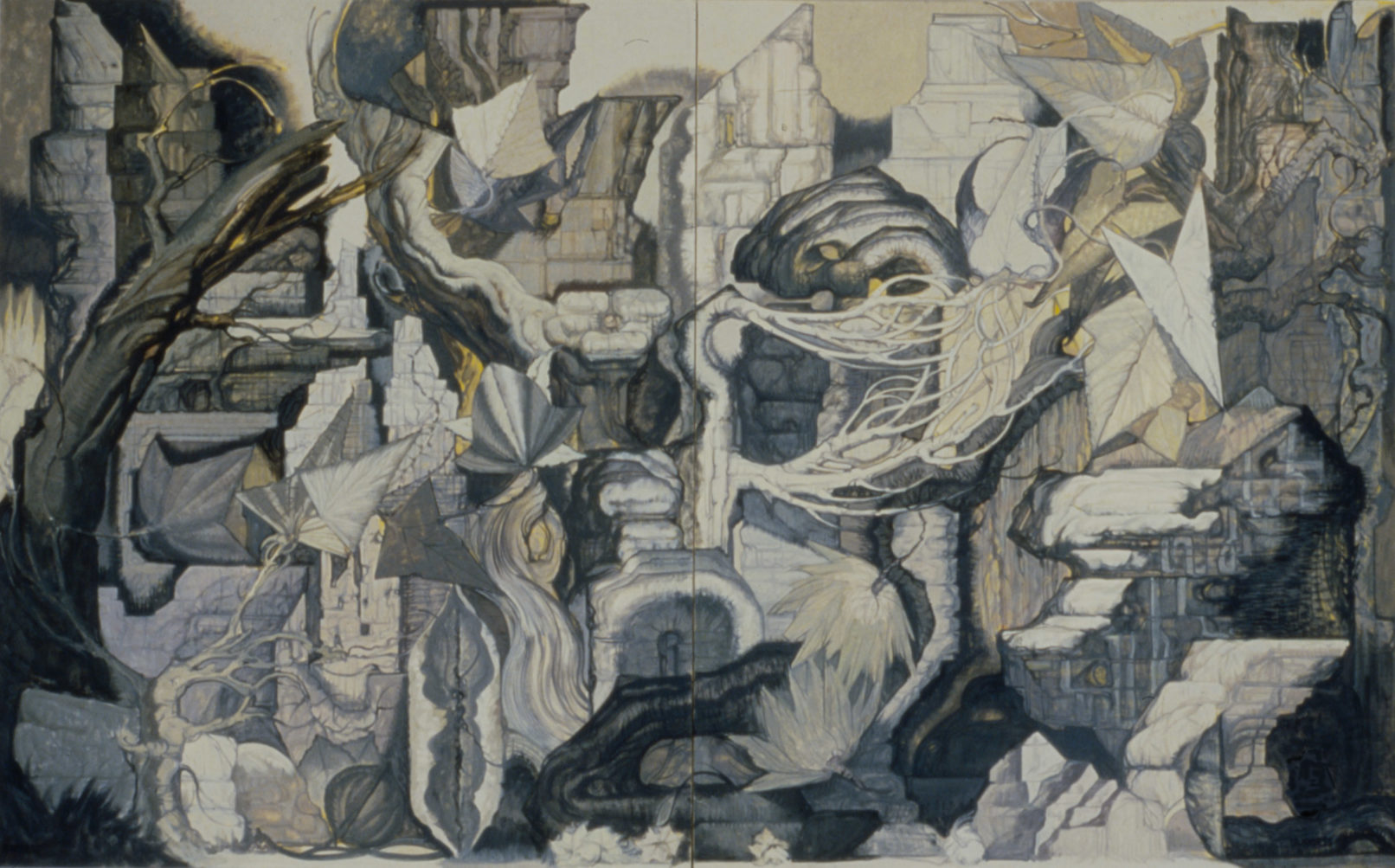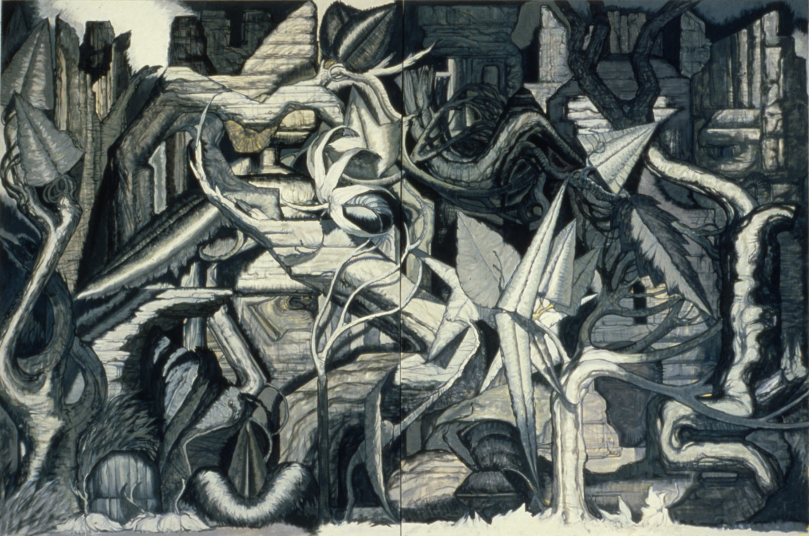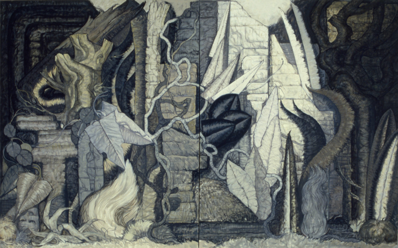 In these large paintings the extreme conflation of the images, derived from nature, extend in dense overlapping planes across the surface of the picture, and outward toward the viewer. Virtually eliminated, space appears to have been occluded in an impacted, spreading frieze of entangled overgrowth.