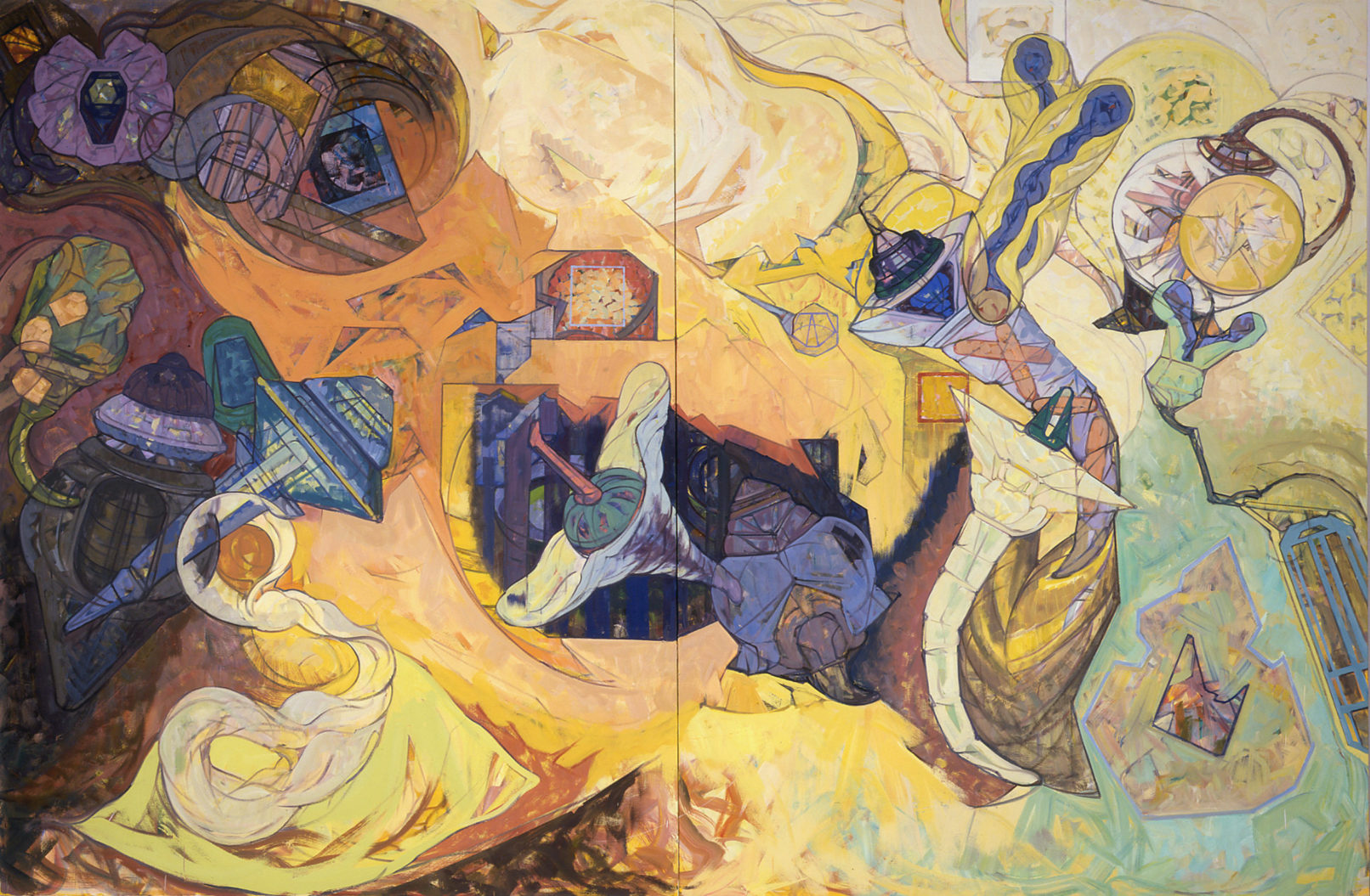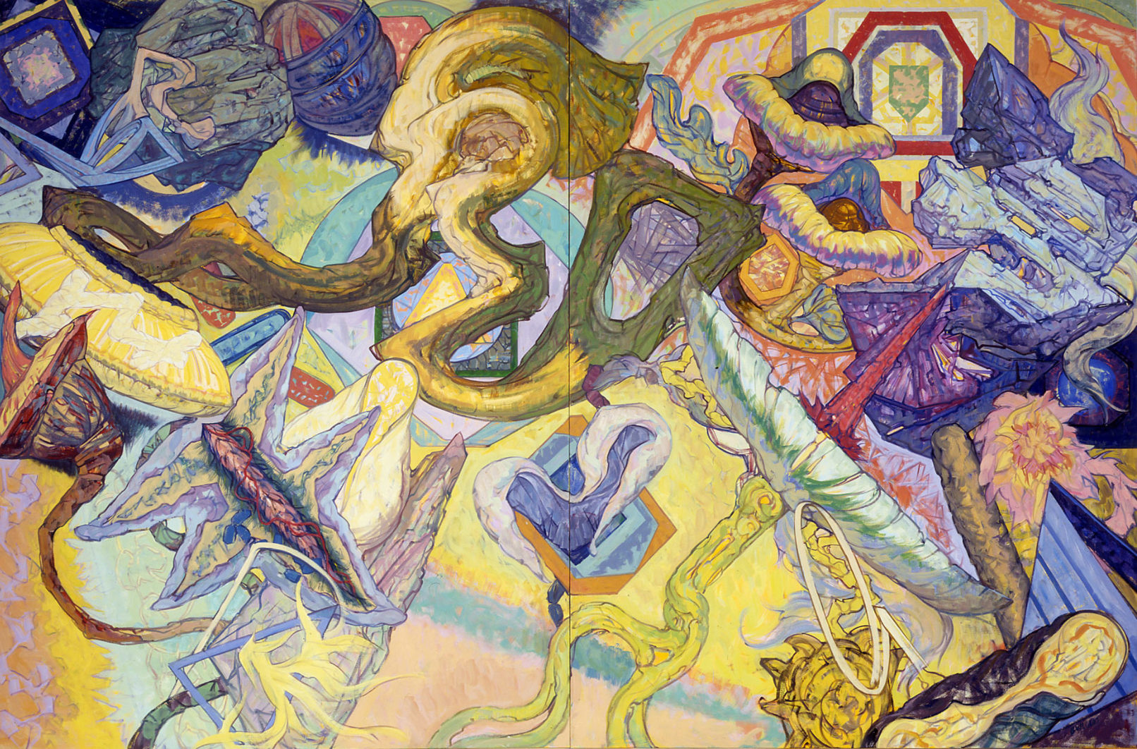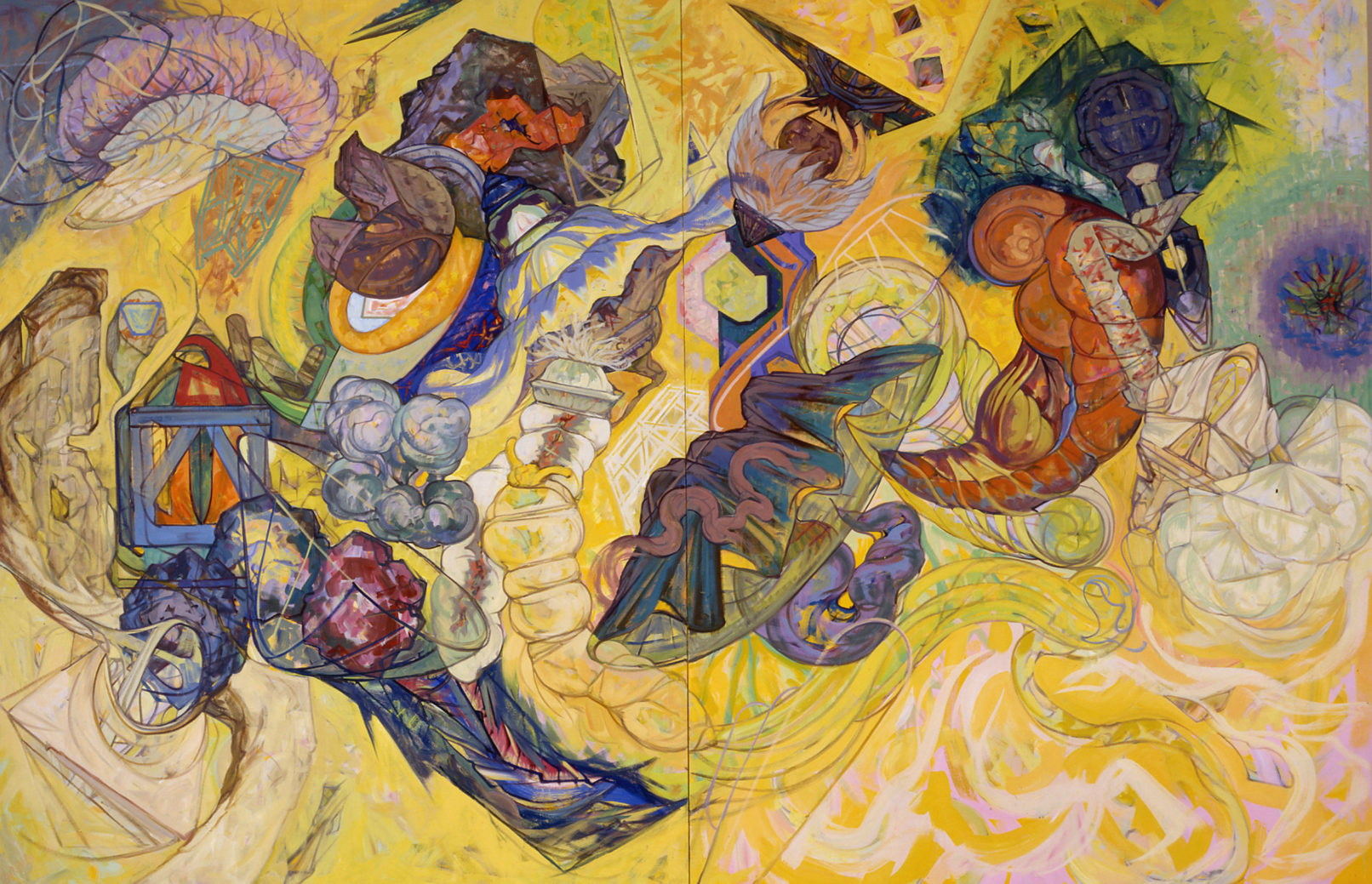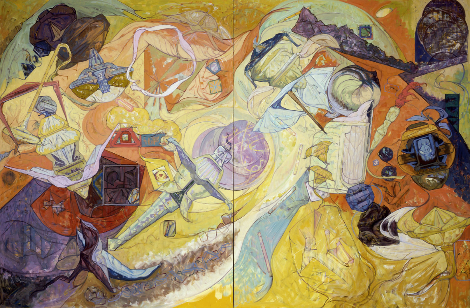 In this group of paintings, I wish to summon up a world of images interacting with forces analogous to the “fabric of space” of modern physics. A space in which forms occupy, are imbedded in, a palpable spatial field. A porous and elastic “skin” that stretches and shrinks, warps, enfolds and opens out, in accordance with kinetic pressures. A space with a layered history, with torn gaps—rents glimpsed in the spatial fabric which disclose passing events and hidden locales. And perhaps unsuspected sightings of an “alternative universe.”
