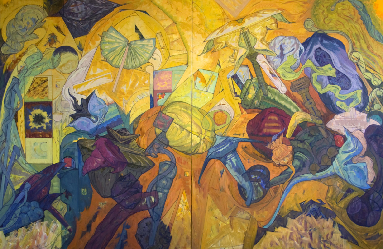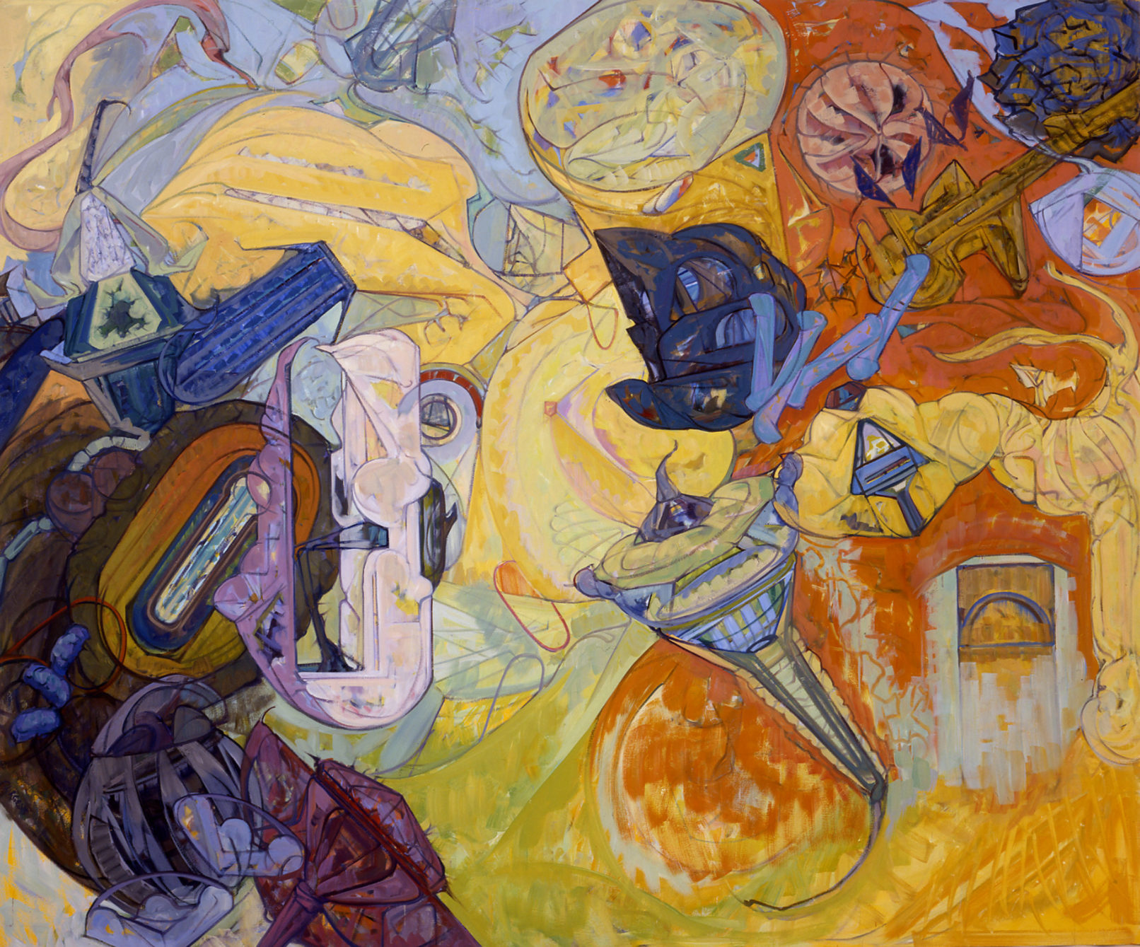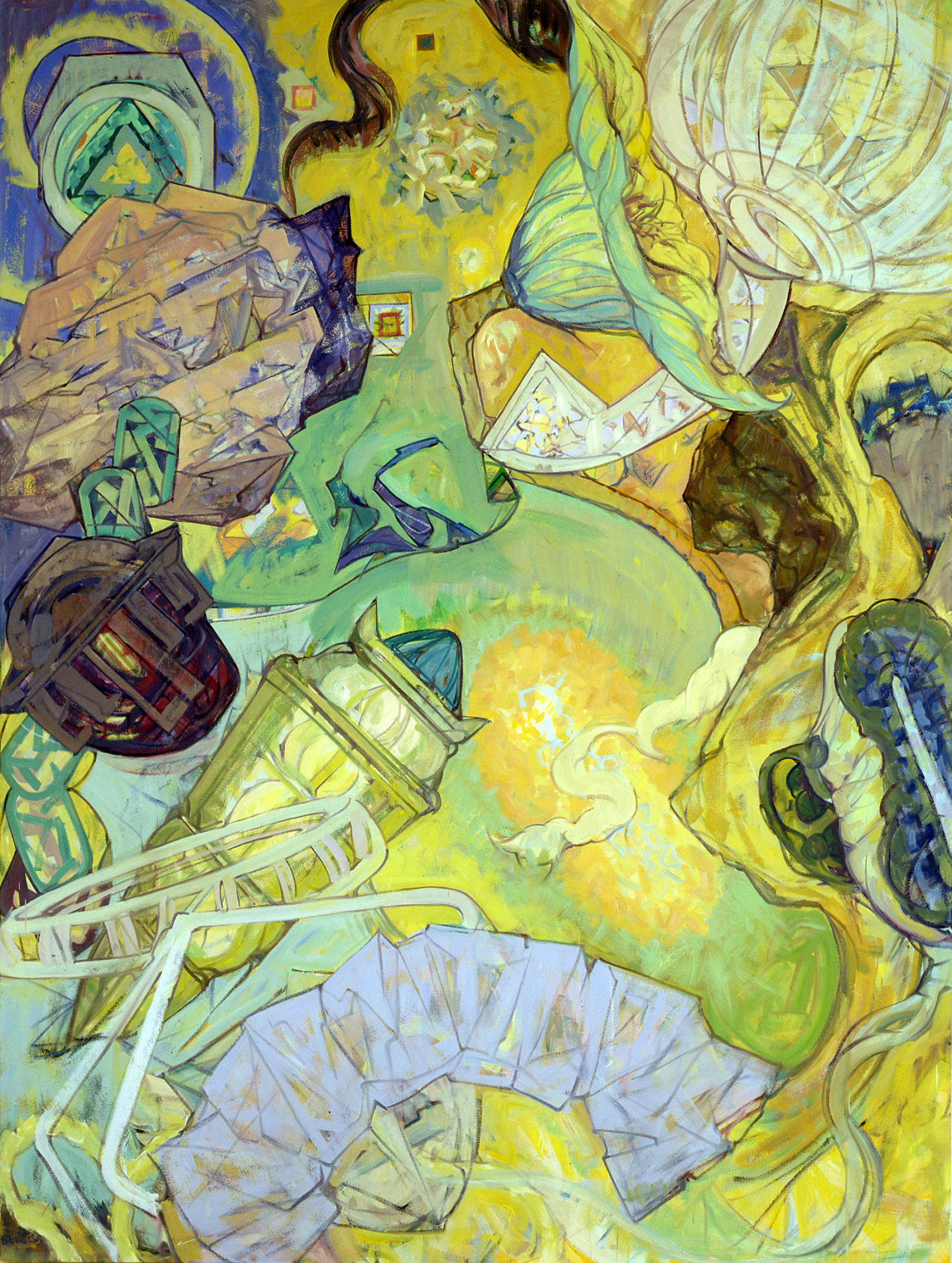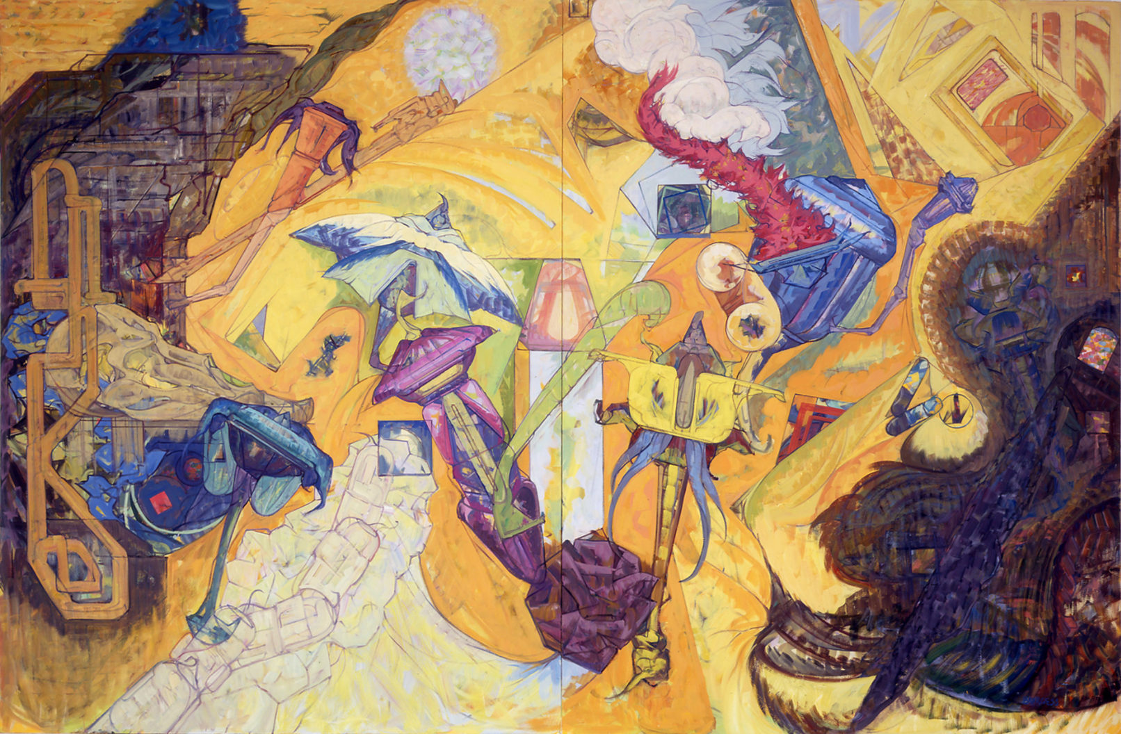In this group of paintings, I wish to summon up a world of images interacting with forces analogous to the “fabric of space” of modern physics. A space in which forms occupy, are imbedded in, a palpable spatial field. A porous and elastic “skin” that stretches and shrinks, warps, enfolds and opens out, in accordance with kinetic pressures. A space with a layered history, with torn gaps—rents glimpsed in the spatial fabric which disclose passing events and hidden locales. And perhaps unsuspected sightings of an “alternative universe.”