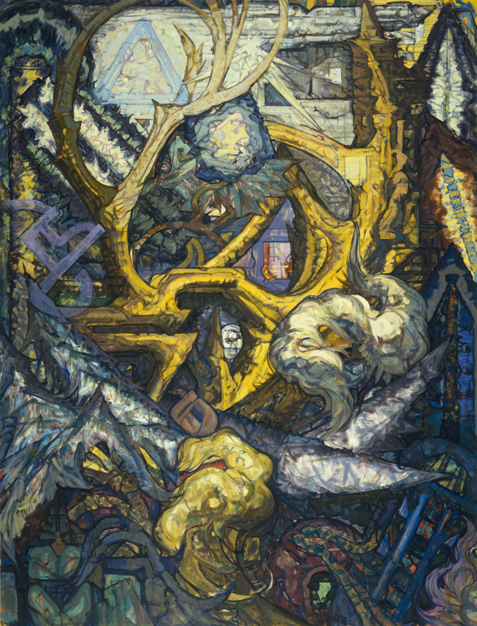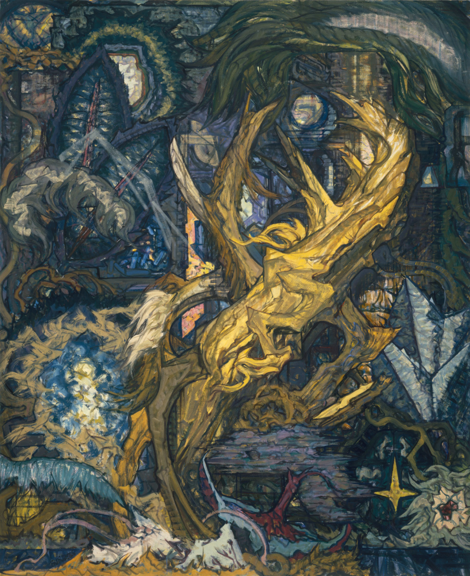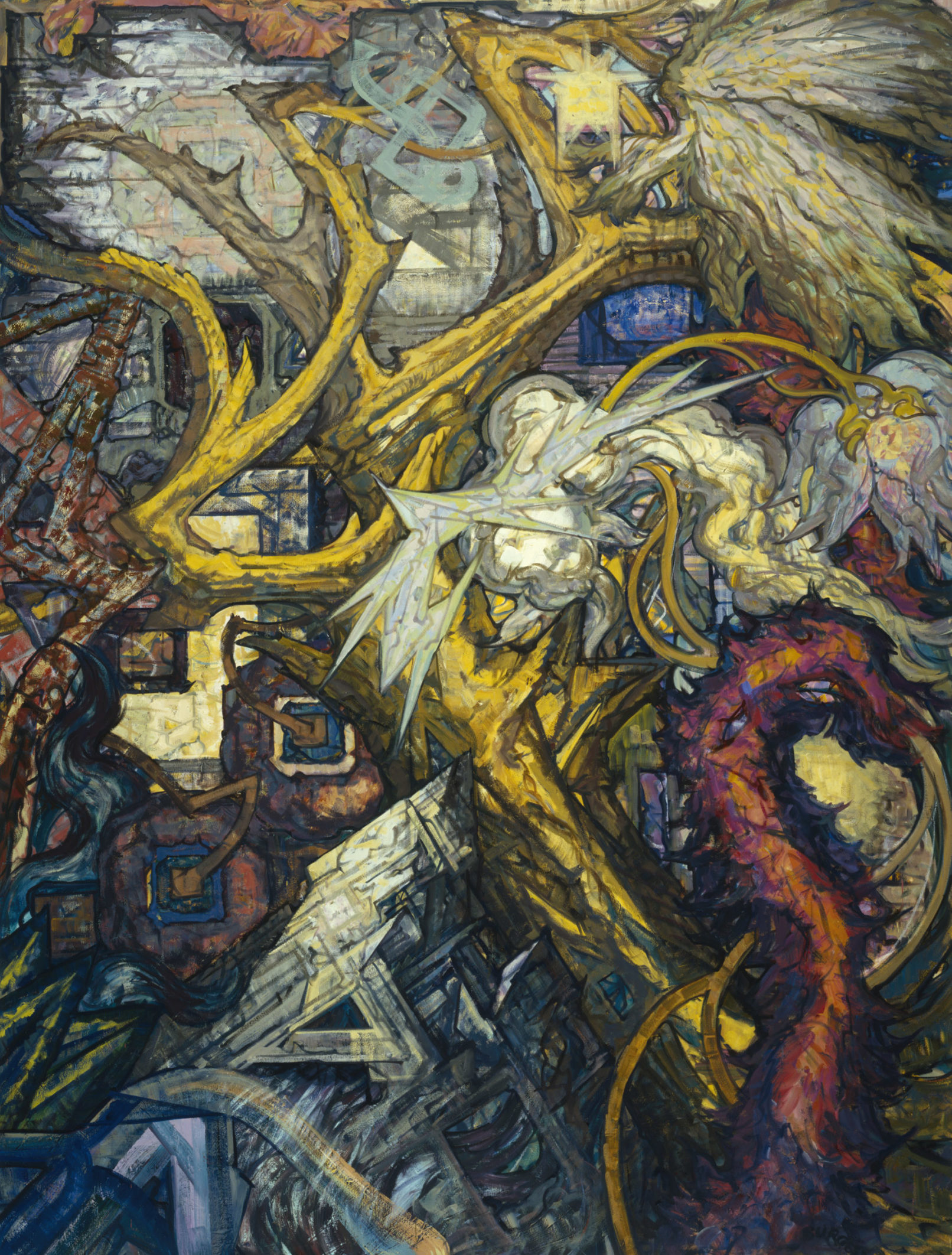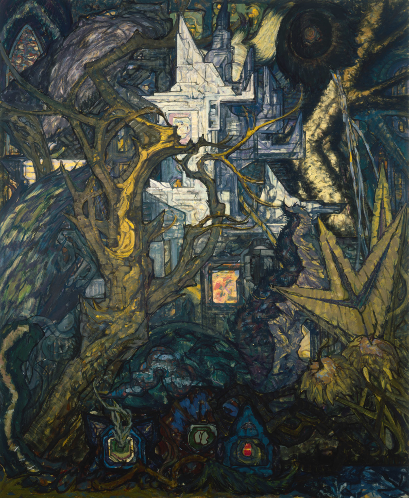 Applying the Greek definition of metaphor as “carrying from one place to another”, Nietzsche stated that metaphor was based on the “desire to be elsewhere.” These works are inspired by this viewpoint. They are full- blown fantasies of a dramatic place apart: atmospheric settings made vivid and expressive by a wealth of hermetic “signs and wonders.” However, a number of these paintings take on a darker aspect: the impression of Nature traumatized.