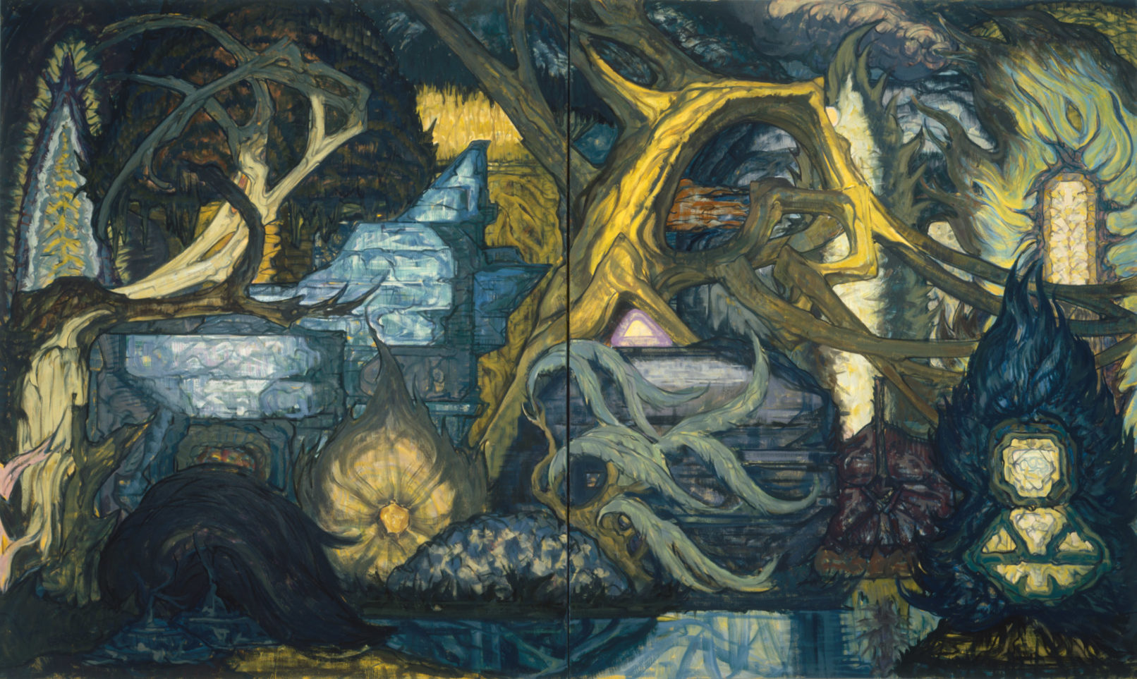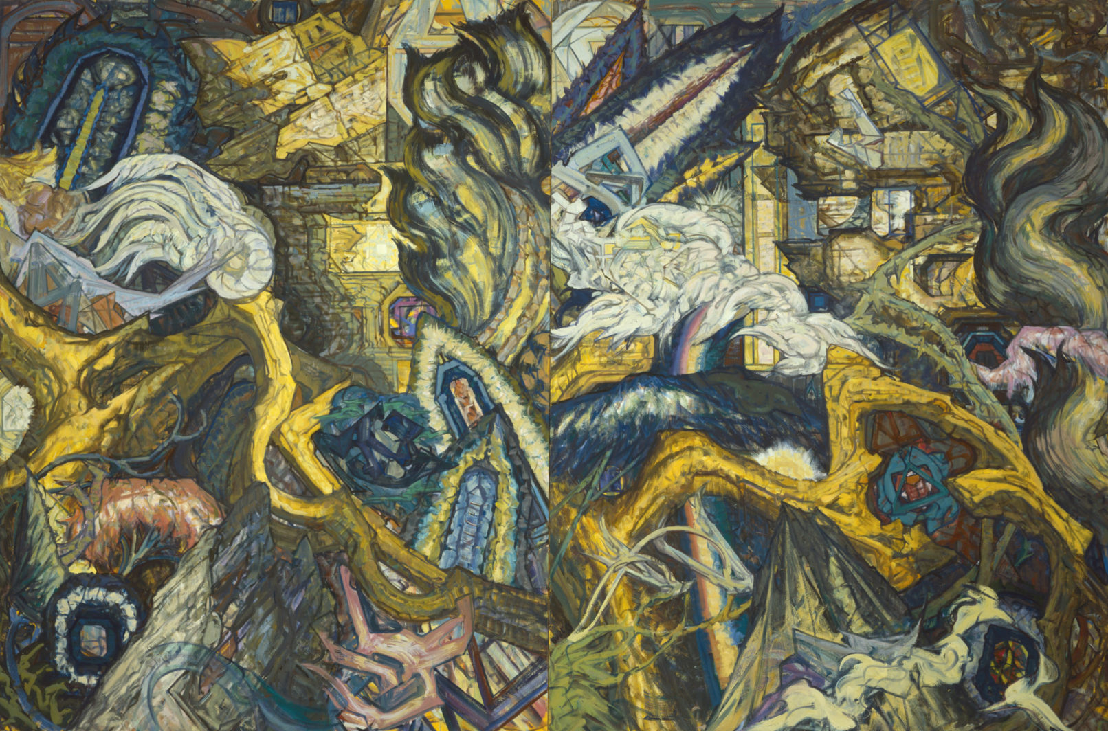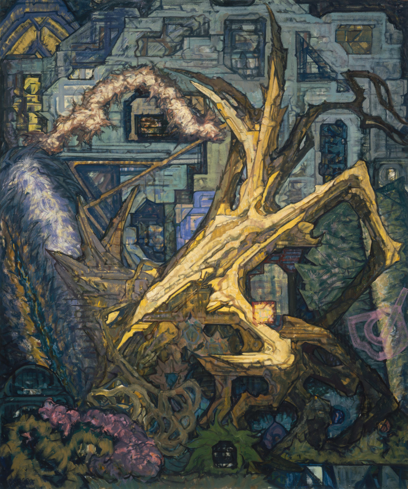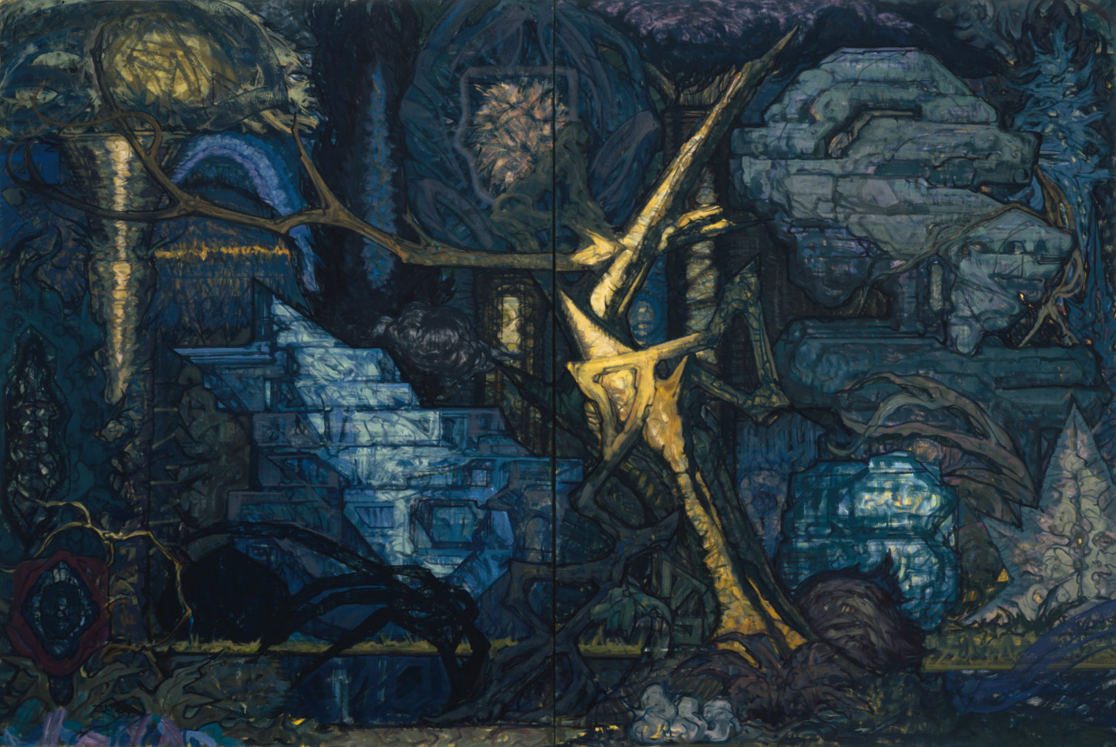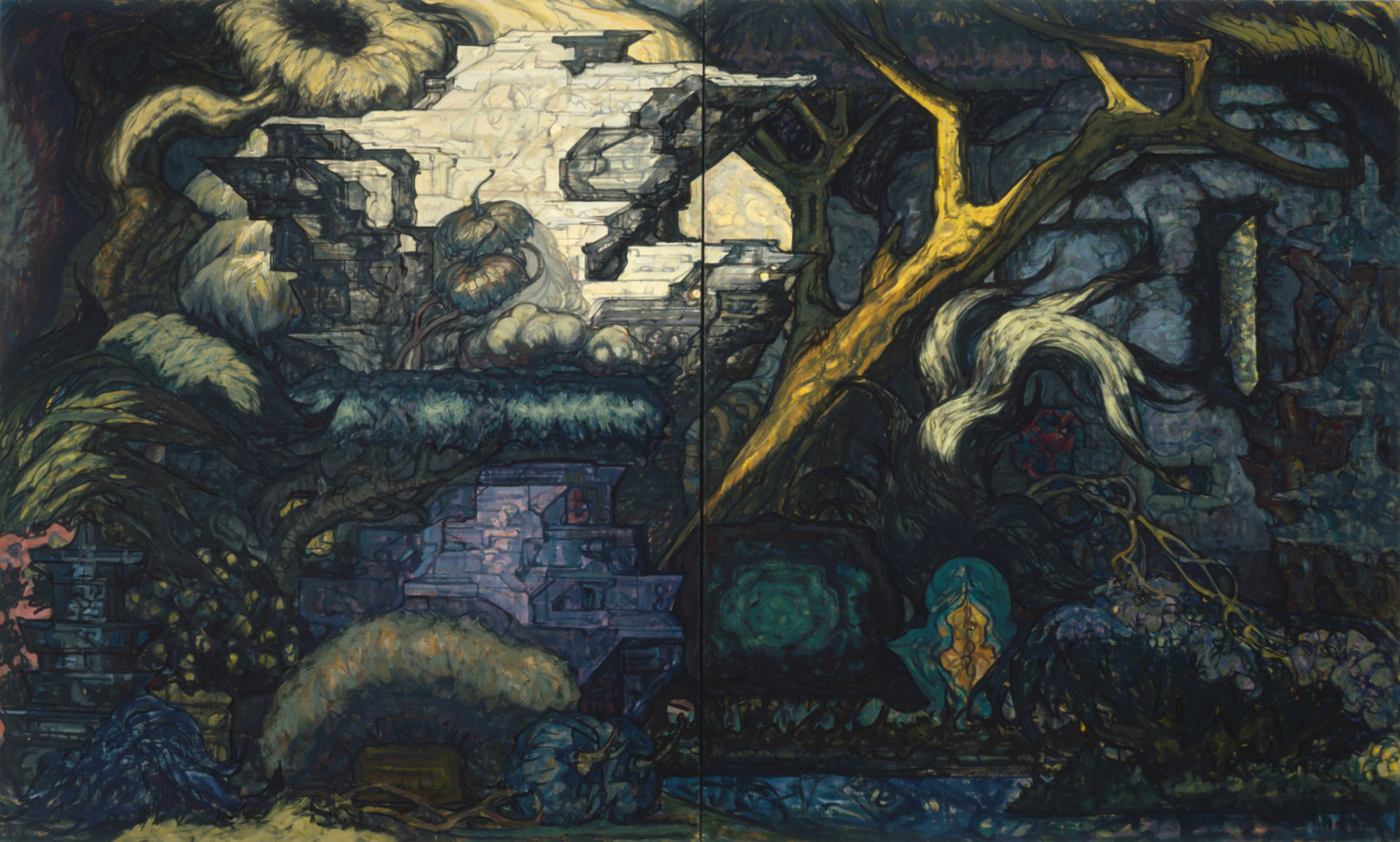 Applying the Greek definition of metaphor as “carrying from one place to another”, Nietzsche stated that metaphor was based on the “desire to be elsewhere.” These works are inspired by this viewpoint. They are full- blown fantasies of a dramatic place apart: atmospheric settings made vivid and expressive by a wealth of hermetic “signs and wonders.” However, a number of these paintings take on a darker aspect: the impression of Nature traumatized.