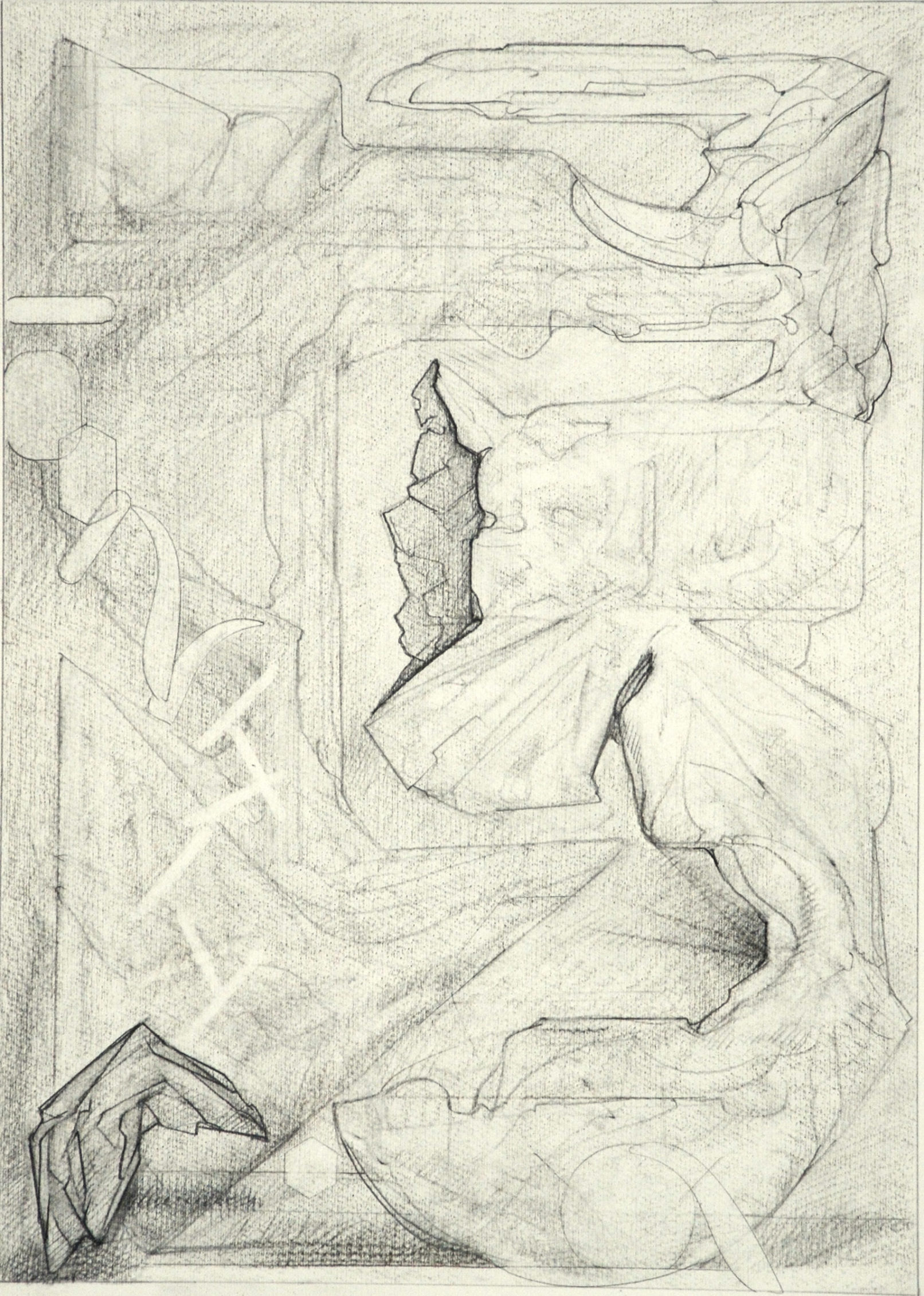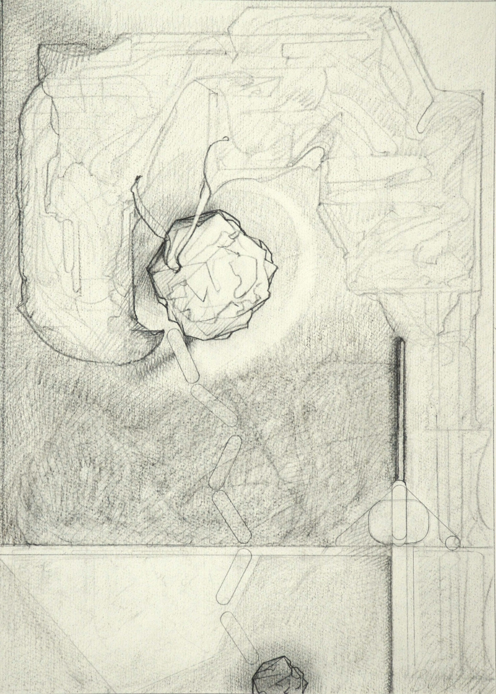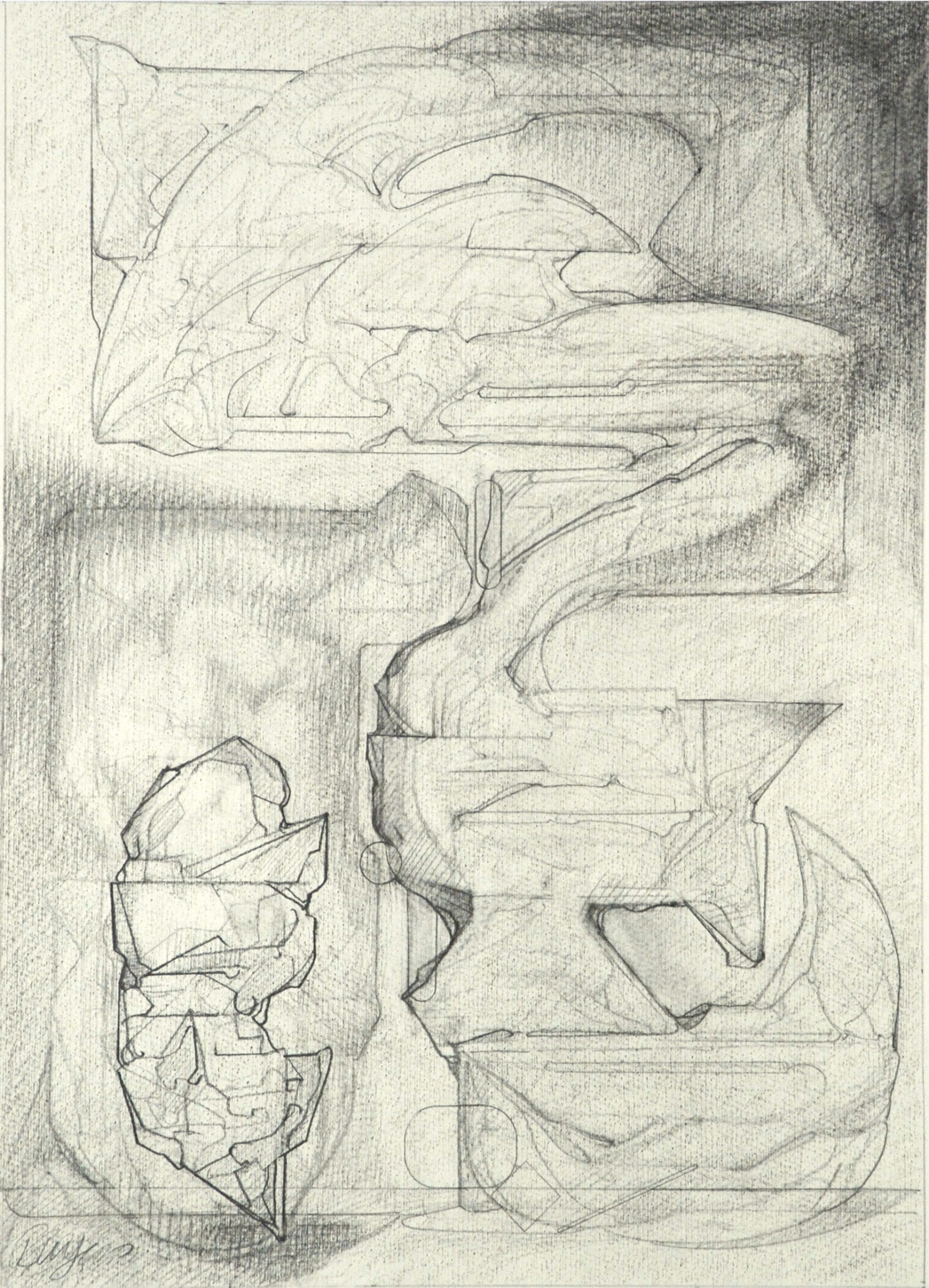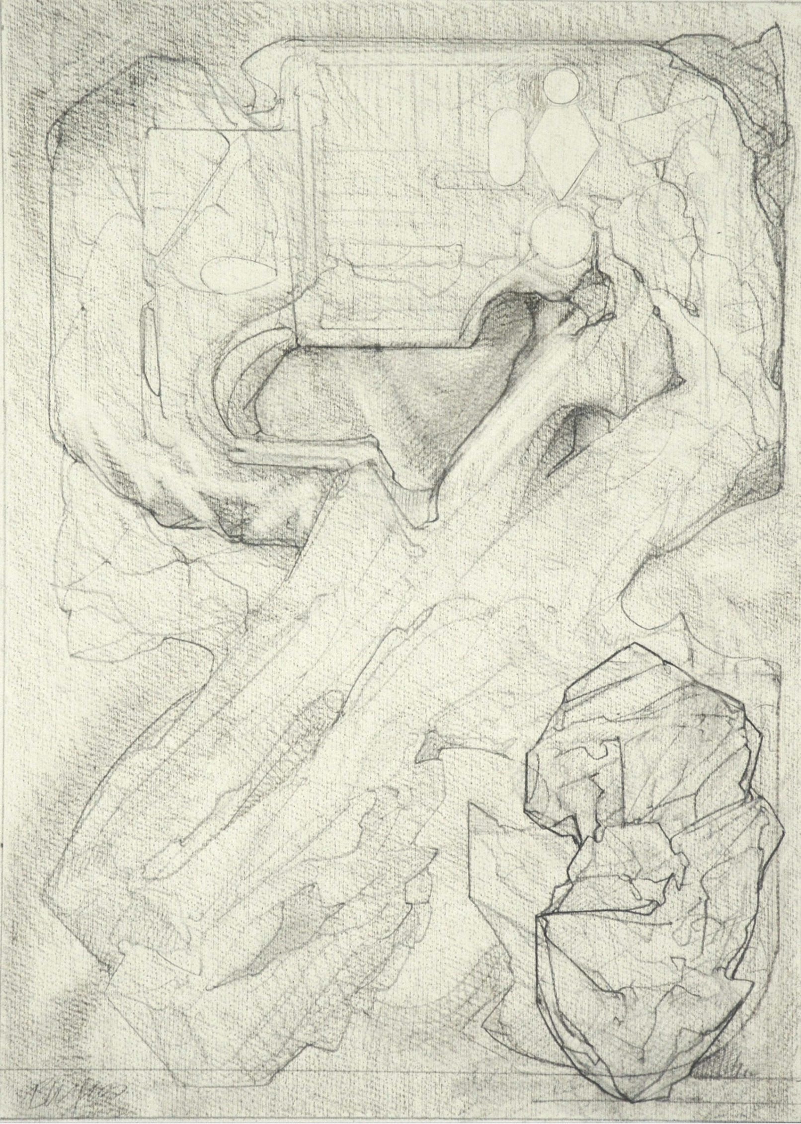 Throughout the drawings, for example, shapes exhibit different phases of object formation, described by different modes and degrees of concretion. Large, indeterminate surfaces (a kind of vague, inchoate “sensory manifold”) variously take on appreciable form: to become “background” monumental masses and, in a further manifestation, refer to free-standing, individuated rock-like objects. These in turn may be rendered as transparent, schematic entities; delineated in flat diagrammatic lines or described as volumetric, opaque bodies subject to gravity (or the lack thereof.) When thrust into the foreground they aggressively occupy space and assert a precise location. Thus, indistinct incorporeal regions become articulated entities. In addition, various abstract serial structures and units of measure, emblematic signs and markings, play a role. Perhaps, as I like to imagine them, they represent tracings of informing agencies in the interplay of conceptual and visual events–analogues of cognitive activity.