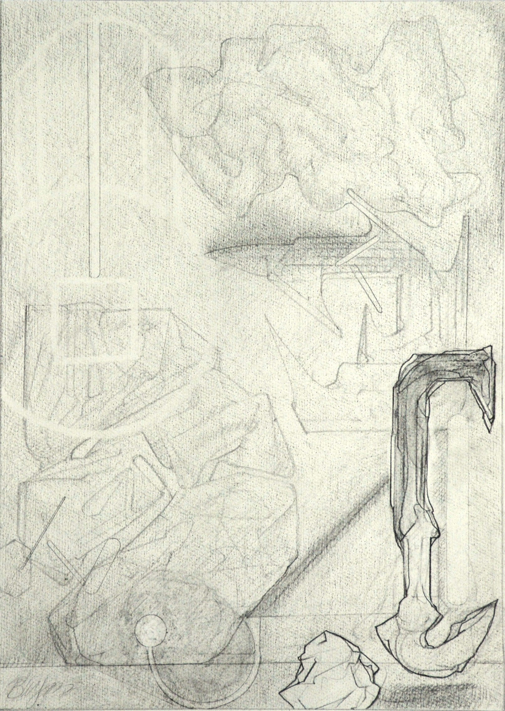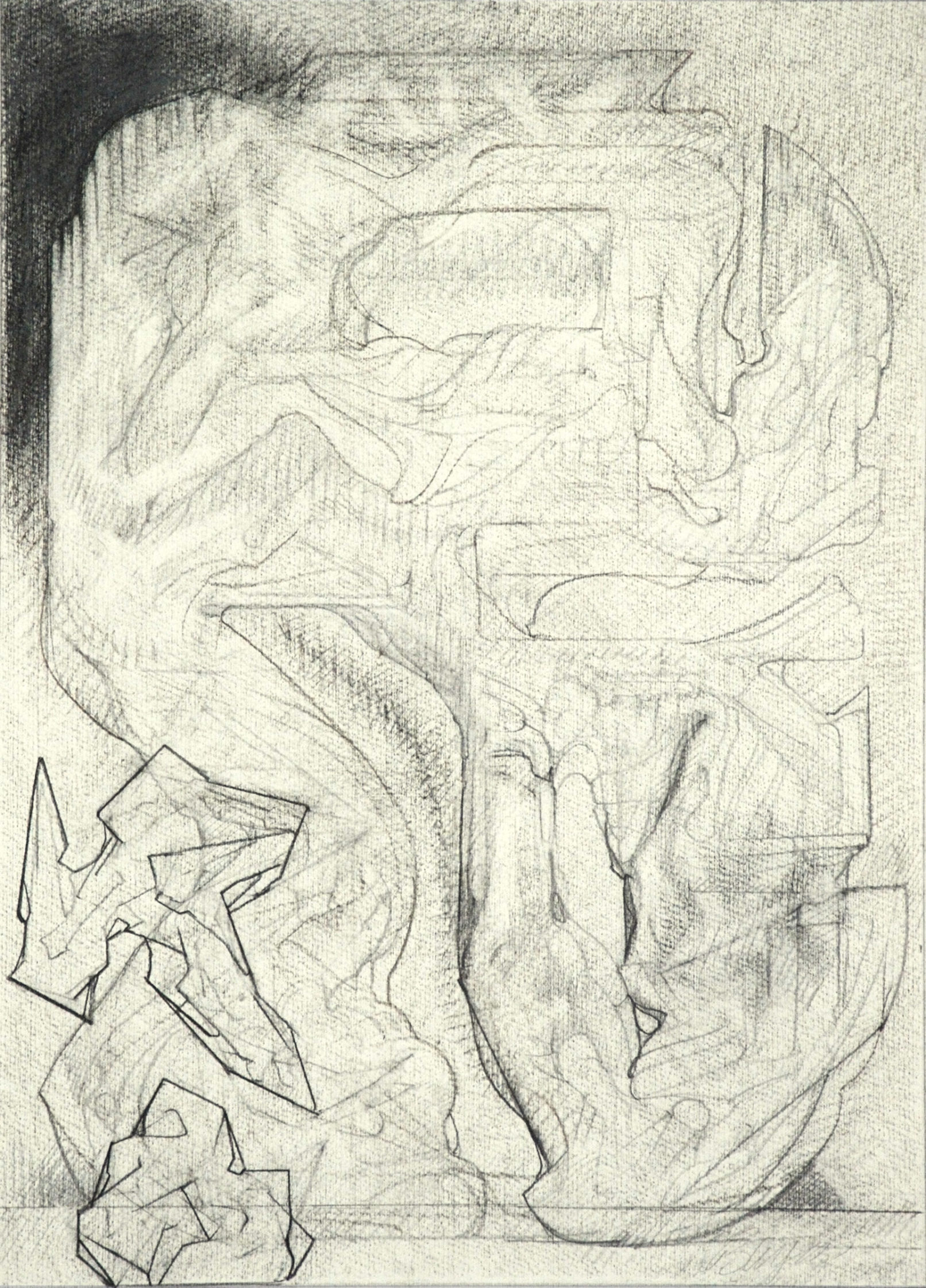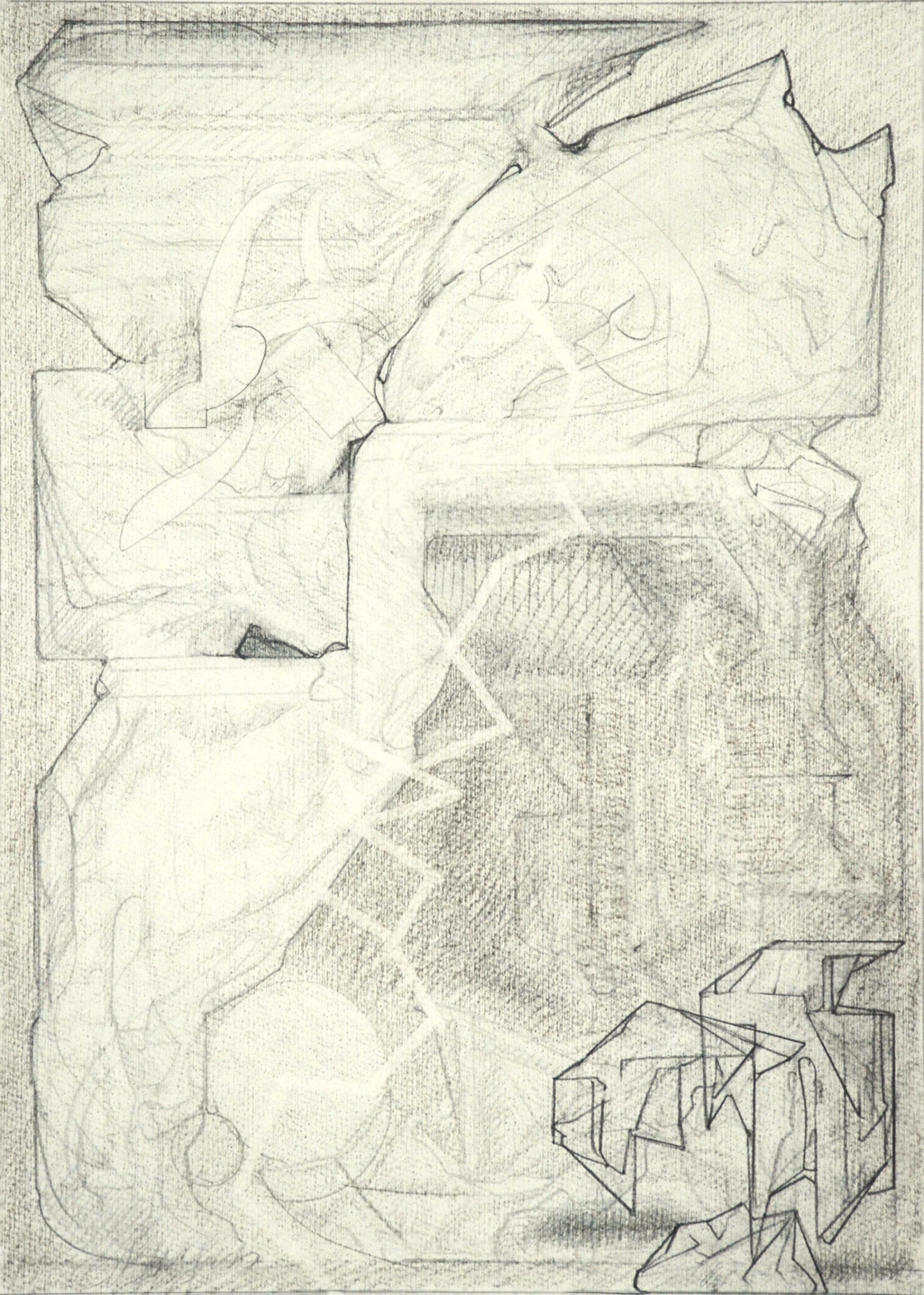 Throughout the drawings, for example, shapes exhibit different phases of object formation, described by different modes and degrees of concretion. Large, indeterminate surfaces (a kind of vague, inchoate “sensory manifold”) variously take on appreciable form: to become “background” monumental masses and, in a further manifestation, refer to free-standing, individuated rock-like objects. These in turn may be rendered as transparent, schematic entities; delineated in flat diagrammatic lines or described as volumetric, opaque bodies subject to gravity (or the lack thereof.) When thrust into the foreground they aggressively occupy space and assert a precise location. Thus, indistinct incorporeal regions become articulated entities. In addition, various abstract serial structures and units of measure, emblematic signs and markings, play a role. Perhaps, as I like to imagine them, they represent tracings of informing agencies in the interplay of conceptual and visual events–analogues of cognitive activity.