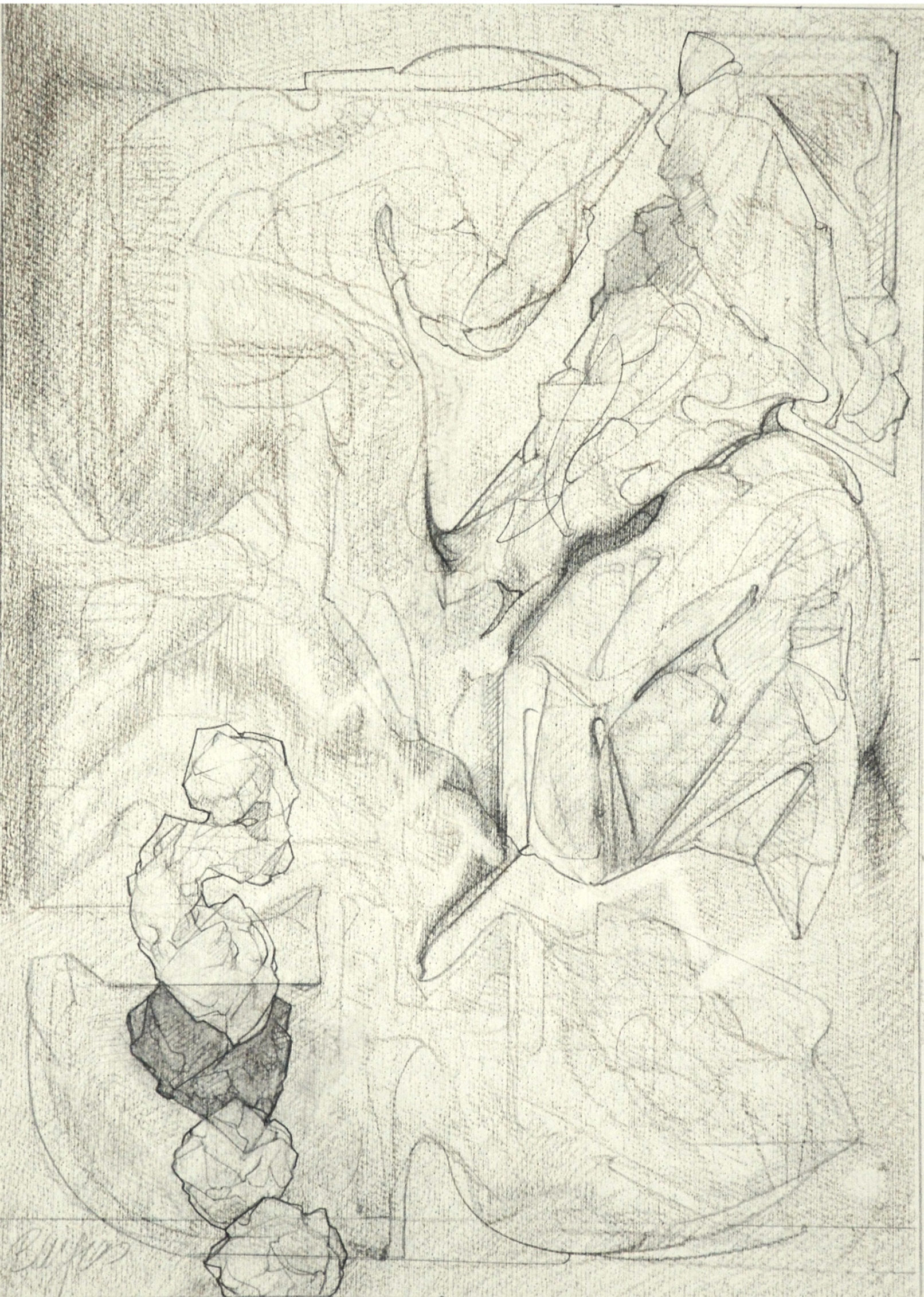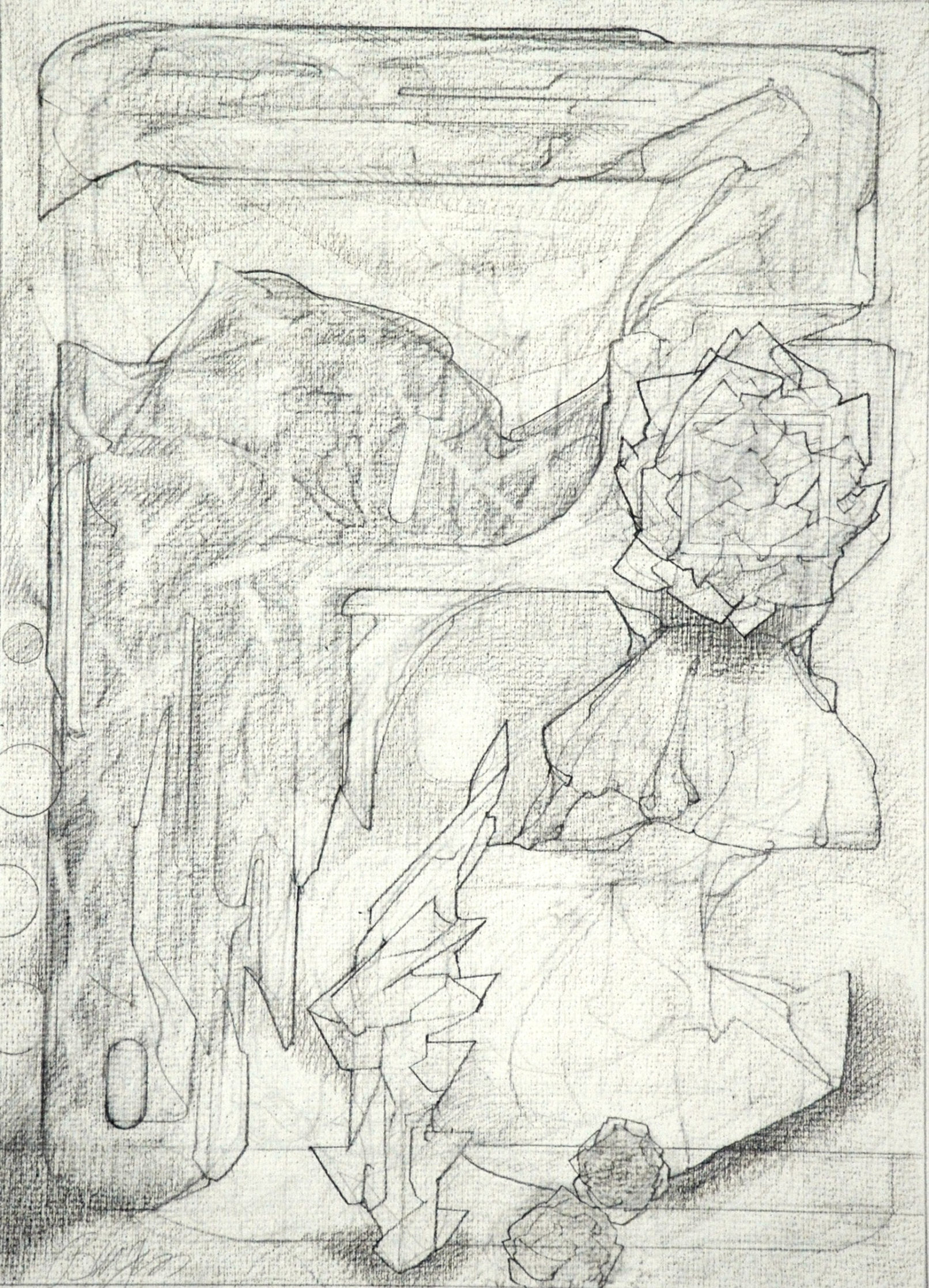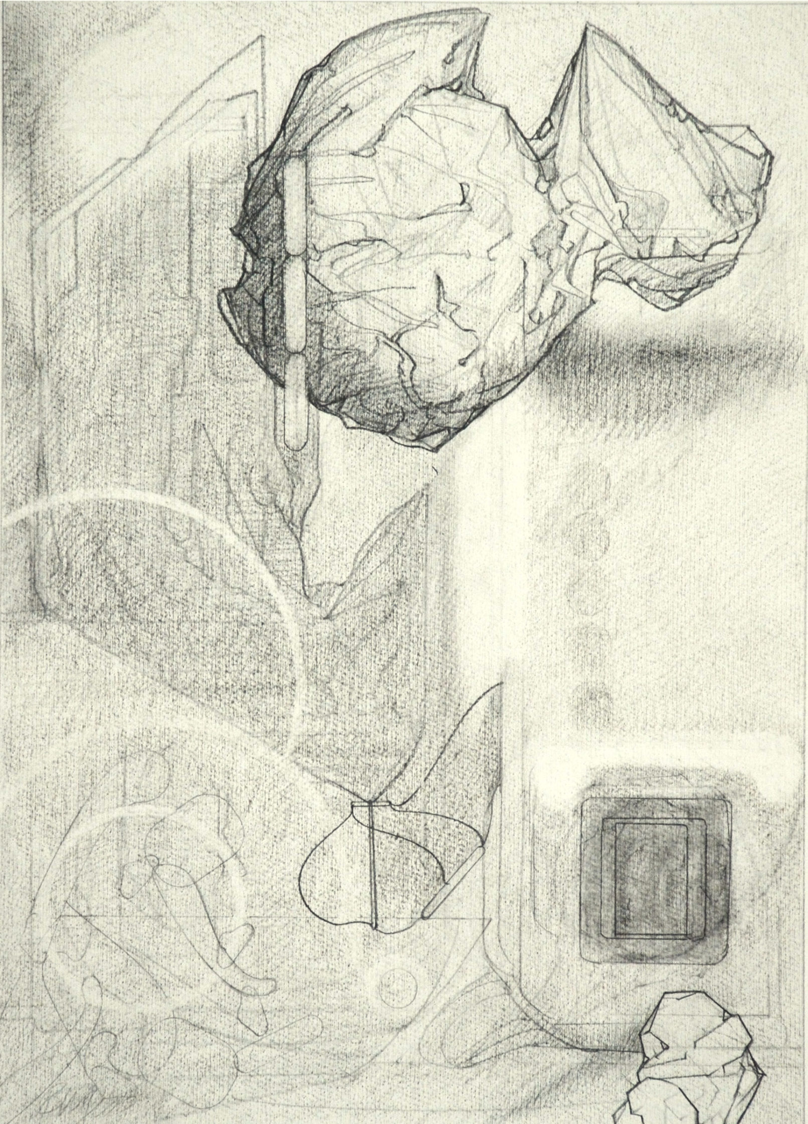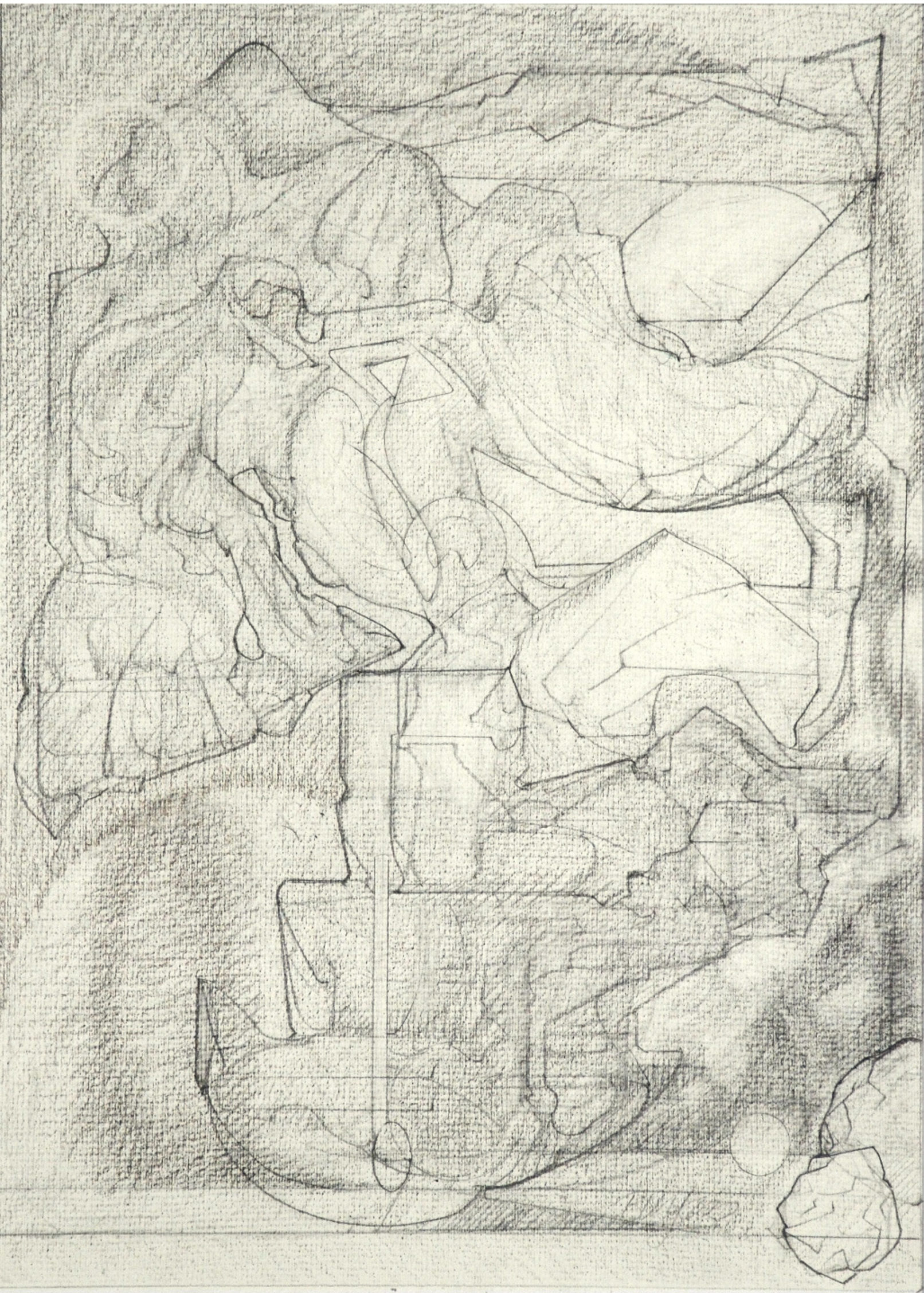 Throughout the drawings, for example, shapes exhibit different phases of object formation, described by different modes and degrees of concretion. Large, indeterminate surfaces (a kind of vague, inchoate “sensory manifold”) variously take on appreciable form: to become “background” monumental masses and, in a further manifestation, refer to free-standing, individuated rock-like objects. These in turn may be rendered as transparent, schematic entities; delineated in flat diagrammatic lines or described as volumetric, opaque bodies subject to gravity (or the lack thereof.) When thrust into the foreground they aggressively occupy space and assert a precise location. Thus, indistinct incorporeal regions become articulated entities. In addition, various abstract serial structures and units of measure, emblematic signs and markings, play a role. Perhaps, as I like to imagine them, they represent tracings of informing agencies in the interplay of conceptual and visual events–analogues of cognitive activity.