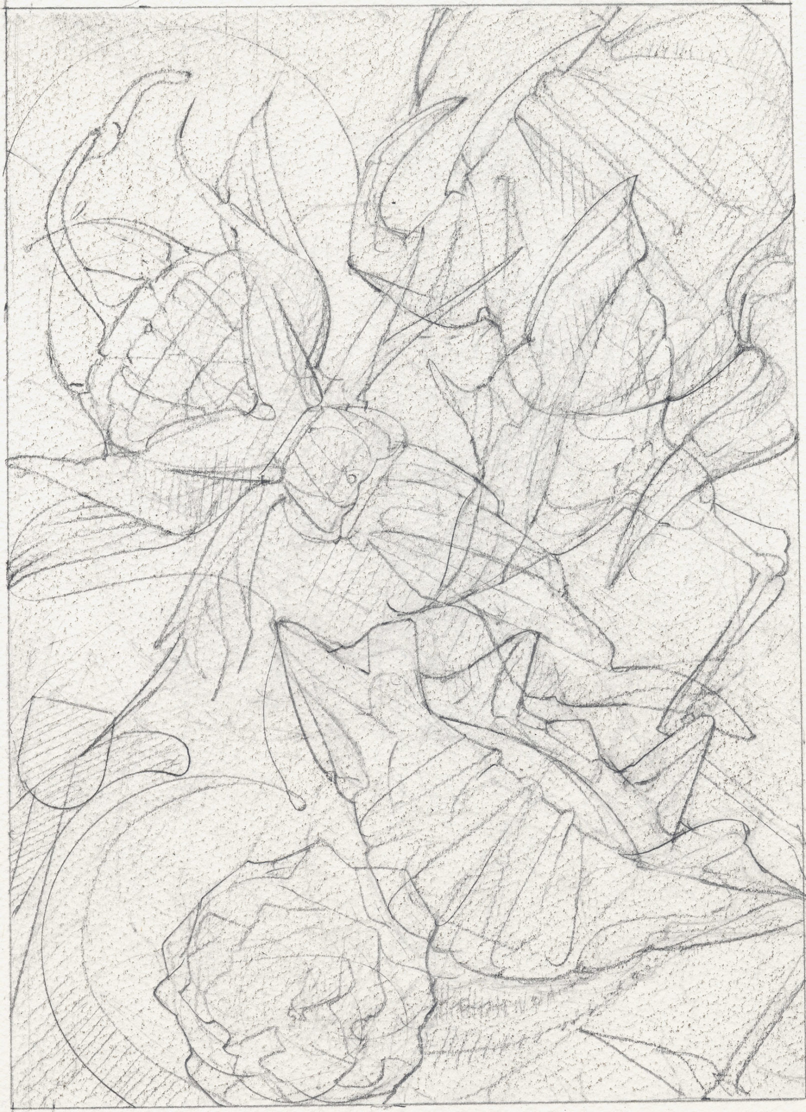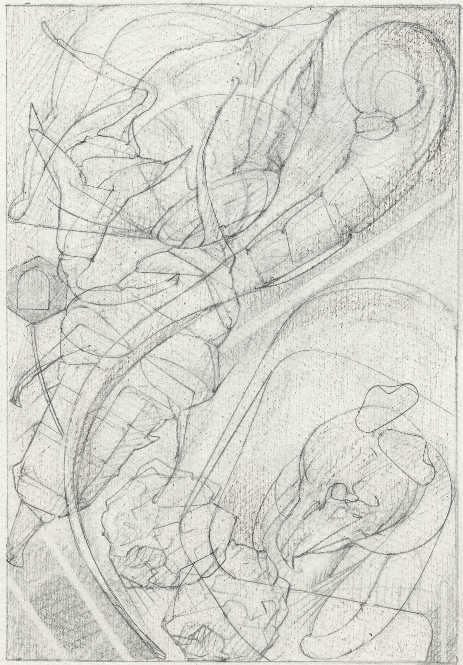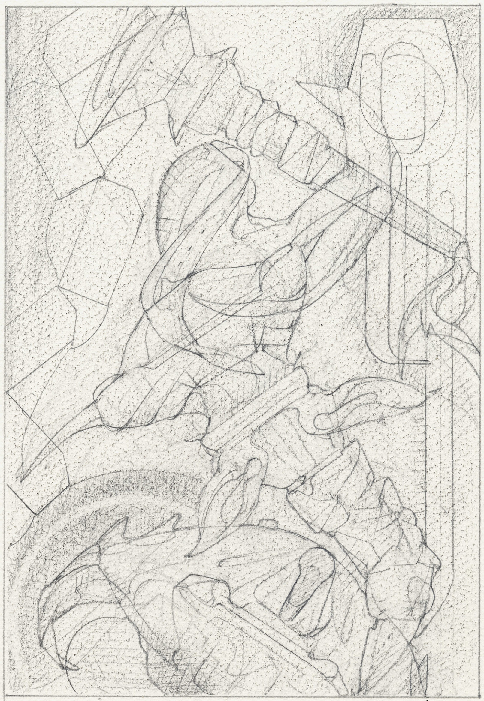 During the summer of 2010 I lived with my wife in an apartment in Amsterdam lent to us by Dutch friends on a street called Kinkerstraat, the name that I have given the series of drawings I executed there. These works, measuring eight by five and a half inches, are very small versions, mini-snapshots, of what occurs on a much greater scale in my large paintings. In these drawings the biomorphic forms are ambushed by the random interference of abstract anomalous elements—an opposing structure in the swim of the continuum. This led me to emphasize the propulsive purposiveness of the bio-forms to persist, as it were, in their own being. Animism is inescapable in my imagery.