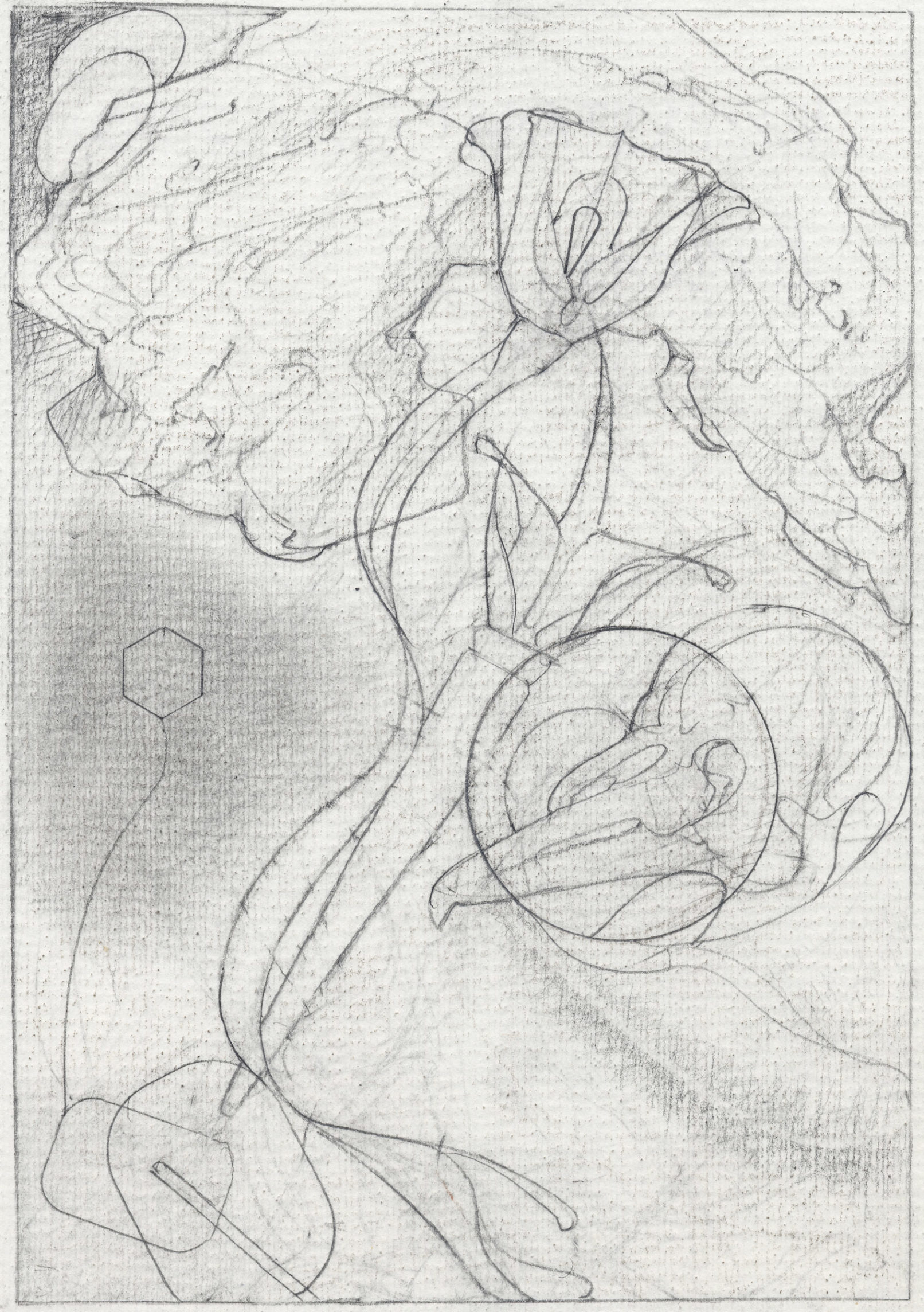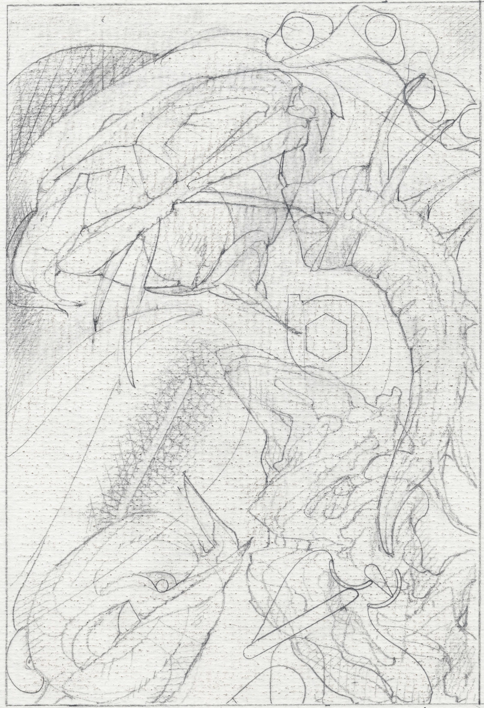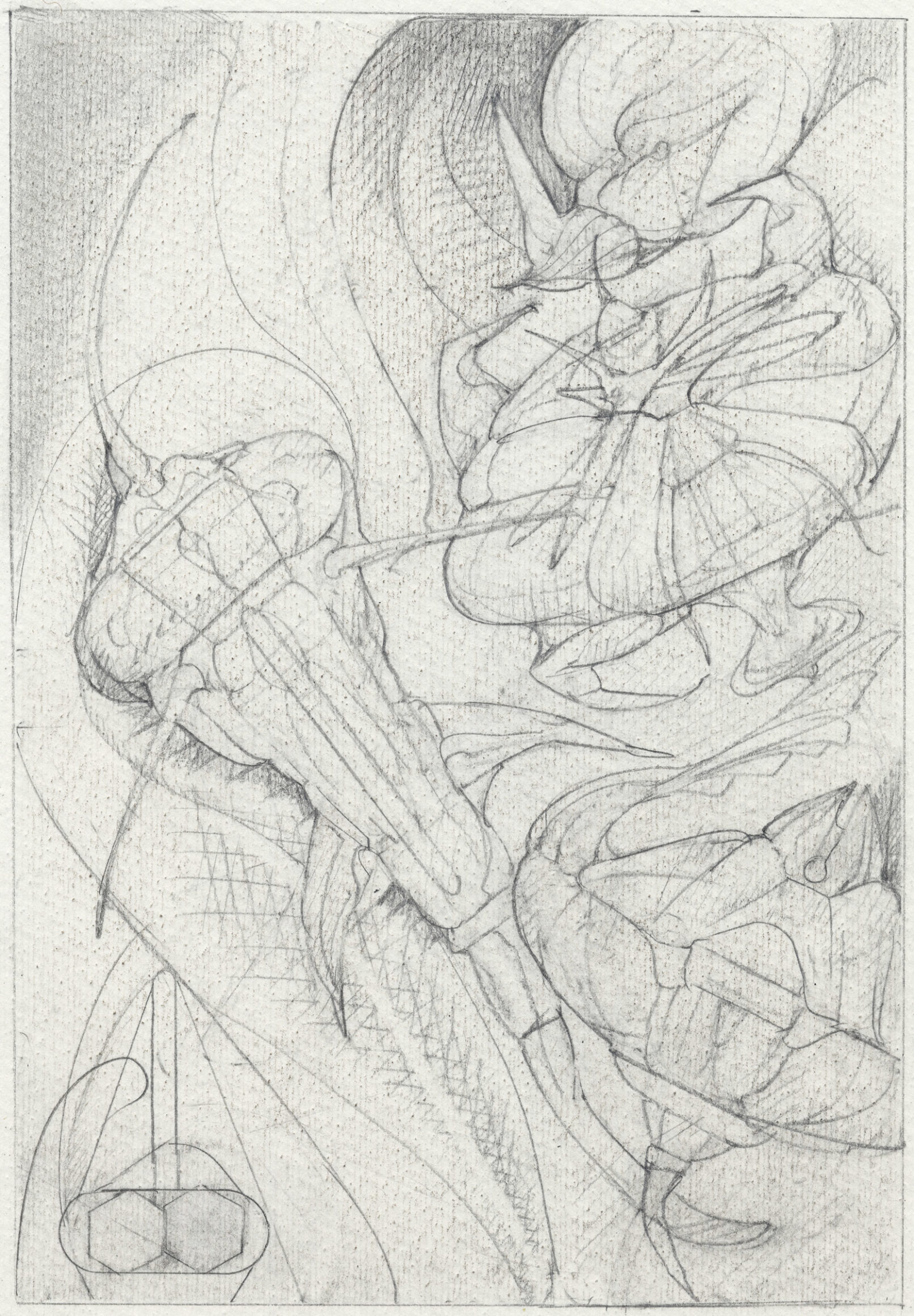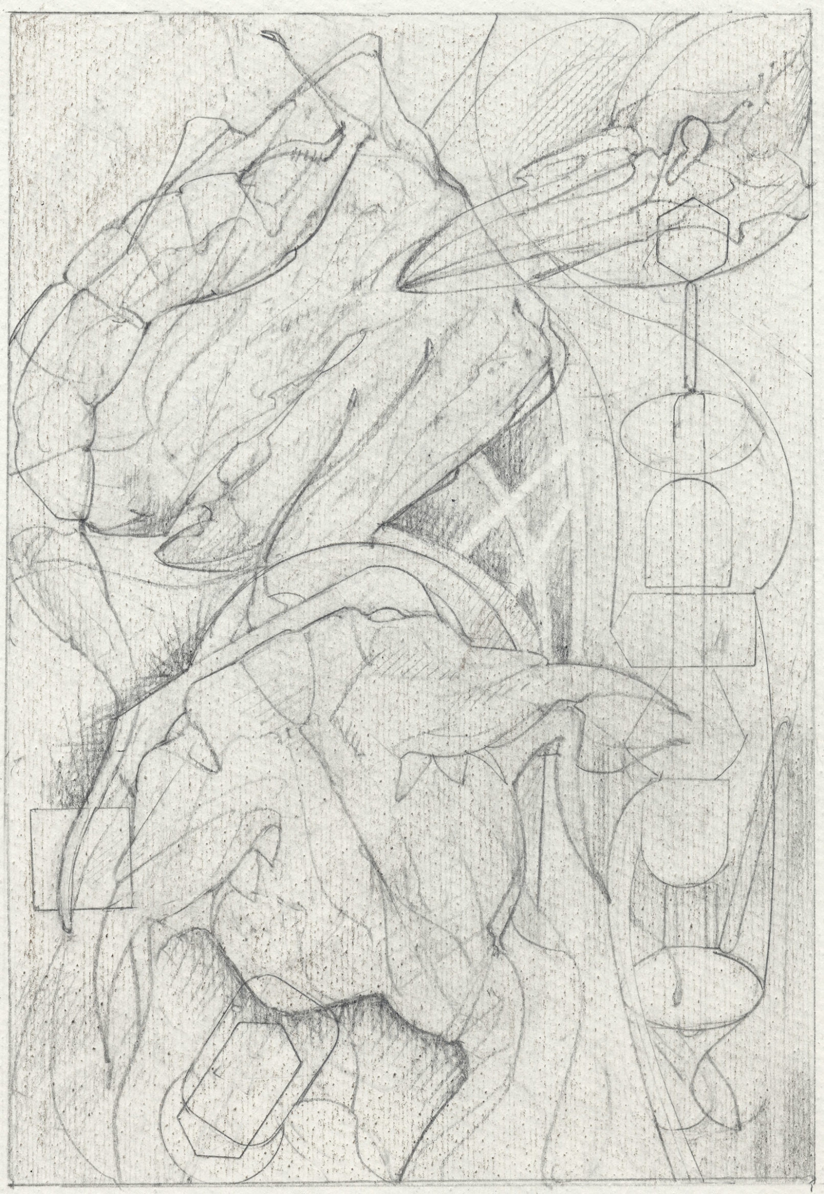 During the summer of 2010 I lived with my wife in an apartment in Amsterdam lent to us by Dutch friends on a street called Kinkerstraat, the name that I have given the series of drawings I executed there. These works, measuring eight by five and a half inches, are very small versions, mini-snapshots, of what occurs on a much greater scale in my large paintings. In these drawings the biomorphic forms are ambushed by the random interference of abstract anomalous elements—an opposing structure in the swim of the continuum. This led me to emphasize the propulsive purposiveness of the bio-forms to persist, as it were, in their own being. Animism is inescapable in my imagery.